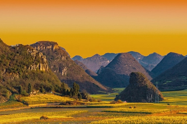 当全国很多地方还在面对萧瑟的冬意时,云南罗平已经迎来了中国最早的一份绚烂春意。这个春节假期,罗平的油菜花就已经开得金黄,正是赏花的好时节。由于地处滇桂黔三省区交界的层峦叠嶂中,罗平的花海与锥形峰林相映成趣。如果你来到金鸡峰丛,登上金鸡岭观景台,花海便尽收眼底,一座座孤峰犹如岛屿一般,荡漾在花海中,美不胜收。如果去牛街景色则截然不同,在螺丝田上,油菜花的金黄层层递进,像一个大花篮,立体而别致。