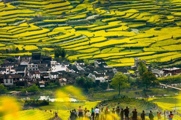 当三月春风拂过江西婺源,漫山遍野的油菜花次第绽放,便成了万众奔赴的春日盛景。在江岭,万亩梯田里金黄的油菜花在风中摇曳生姿;在篁岭,粉墙黛瓦的徽派建筑依山而建,如果遇上阳光明媚的日子,无论是推开民居的窗户远眺,还是站在高空栈道上俯瞰,都会让你惊艳不已、陶醉其中。