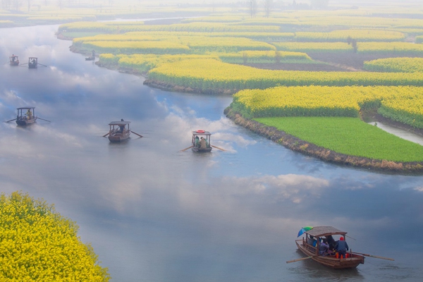 相比其他地区,江苏兴化的油菜花独特于“花在水中”。当地人在湖荡沼泽地带开挖网状深沟,将泥土一方一方堆积成垛。水网密布中,一个“垛”就如一座小岛。当垛上的油菜怒放,水黄交融,一望无际。荡舟其间,就如画中游,登高远望,一块块的油菜花田好像漂浮于水面之上,奇妙极了。